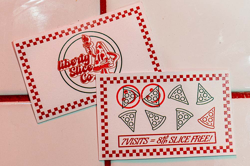 Can’t get enough of that New York Slice? Grab a loyalty card from the counter and get a stamp for each visit. Your 7th visit gets you an 8th slice free!